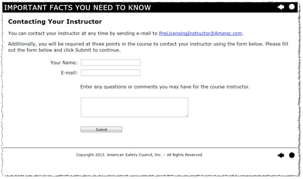 Yes. At three points in the course — in the introduction, halfway through the course, and at the end of the course — North Carolina requires that students correspond with their instructor. Students must enter their name, e-mail address, and a question or comment for their course instructor before moving forward in the course.